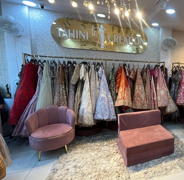 Tahini Creation is your go-to fashion boutique in Delhi. Offering designer outfits for rent and sale, including bridal lehengas, gowns, and sarees. Experience custom stitching services and explore our curated bridal jewelry collection. Visit our fully equipped studio for makeup artists and content creators for effortless elegance and convenience.